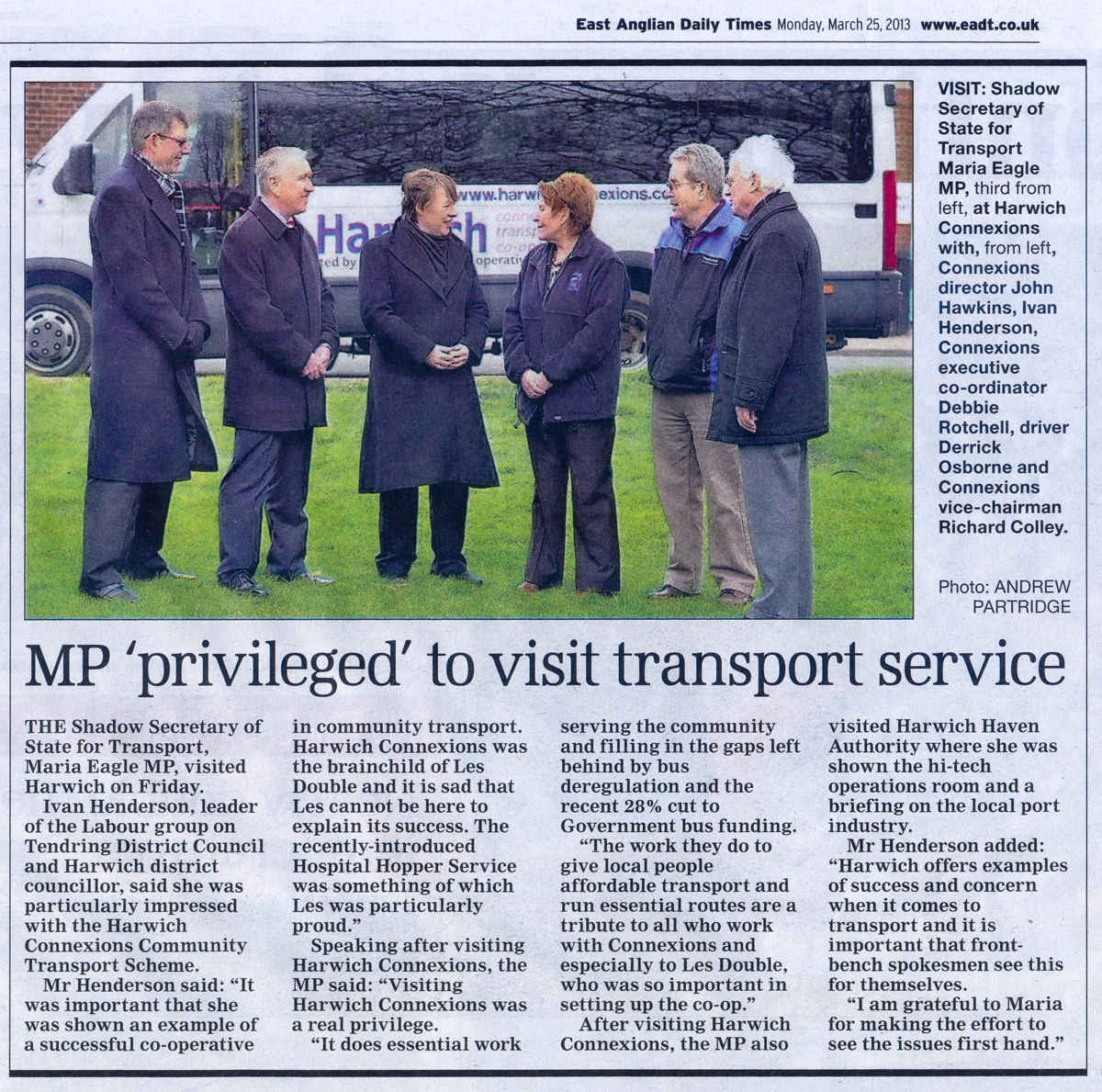 Maria Eagle is Labour’s front bench spokeswoman for Transport and is particularly interested to visit the Harwich Connexions Community Transport Scheme which was established through the then Labour Government’s Market Towns Initiative.