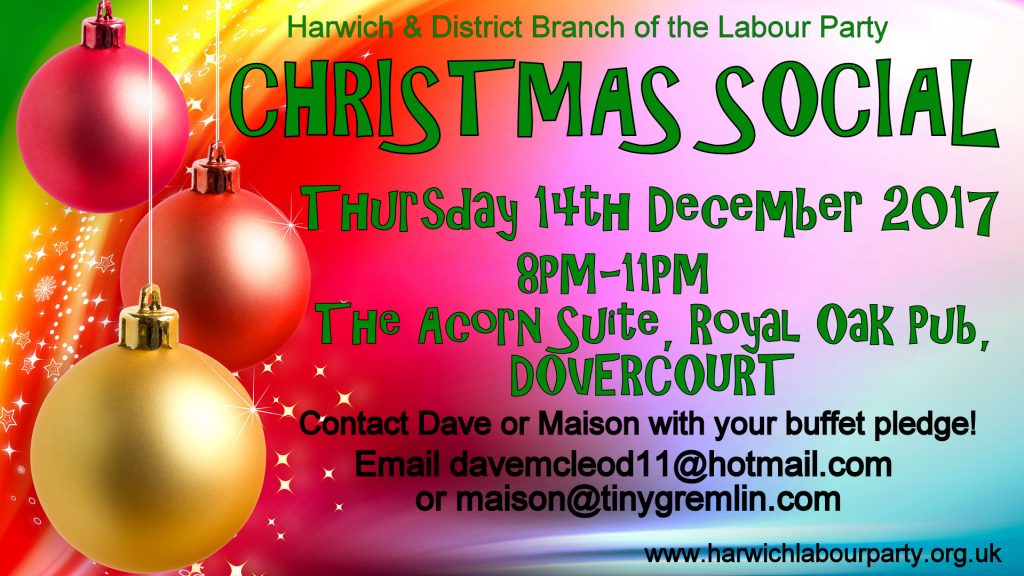 Branch Christmas Social, Thursday 14th Dec 2017 8PM at the Acorn Suite, Royal Oak Pub. RAFFLE on the NIGHT!